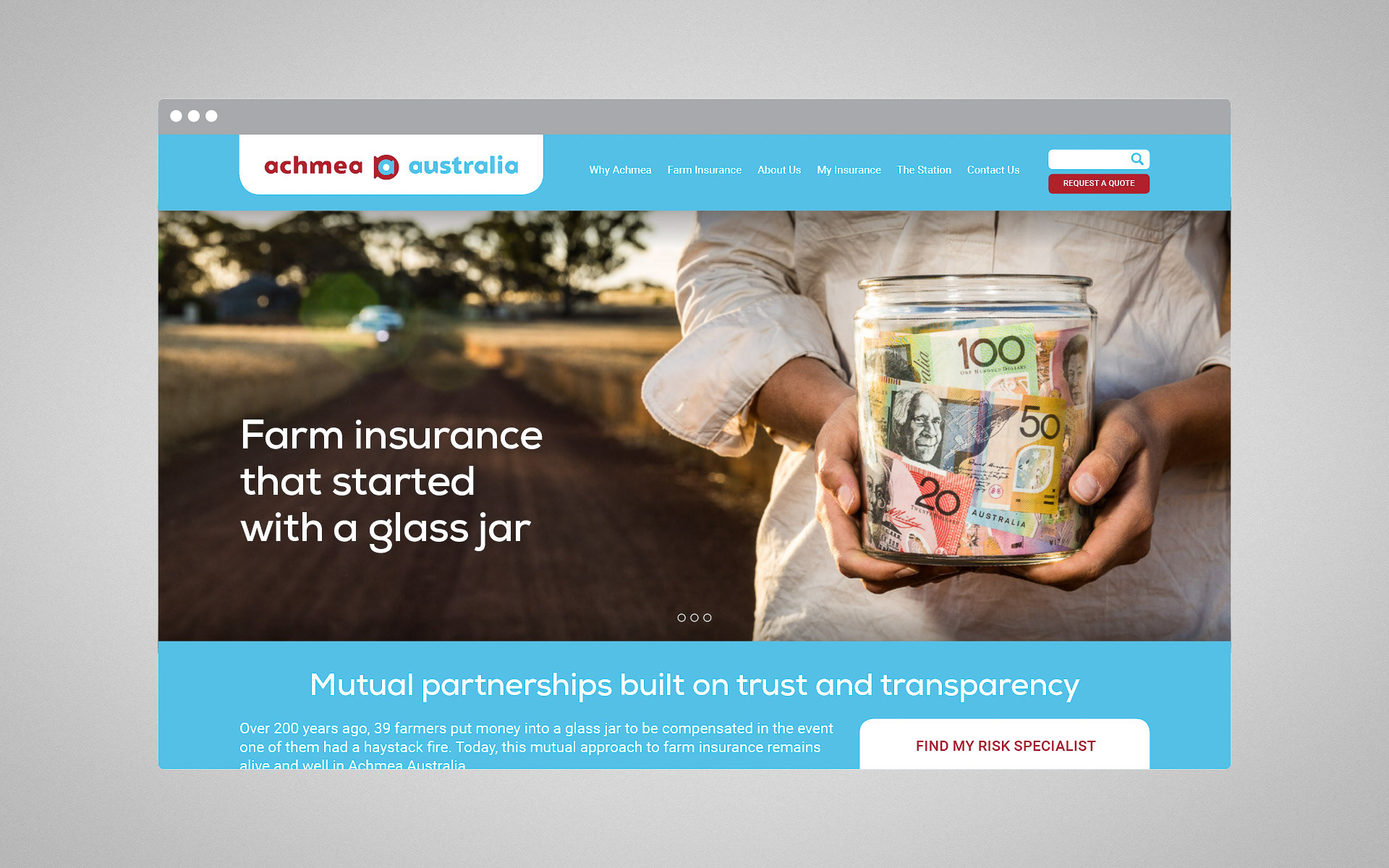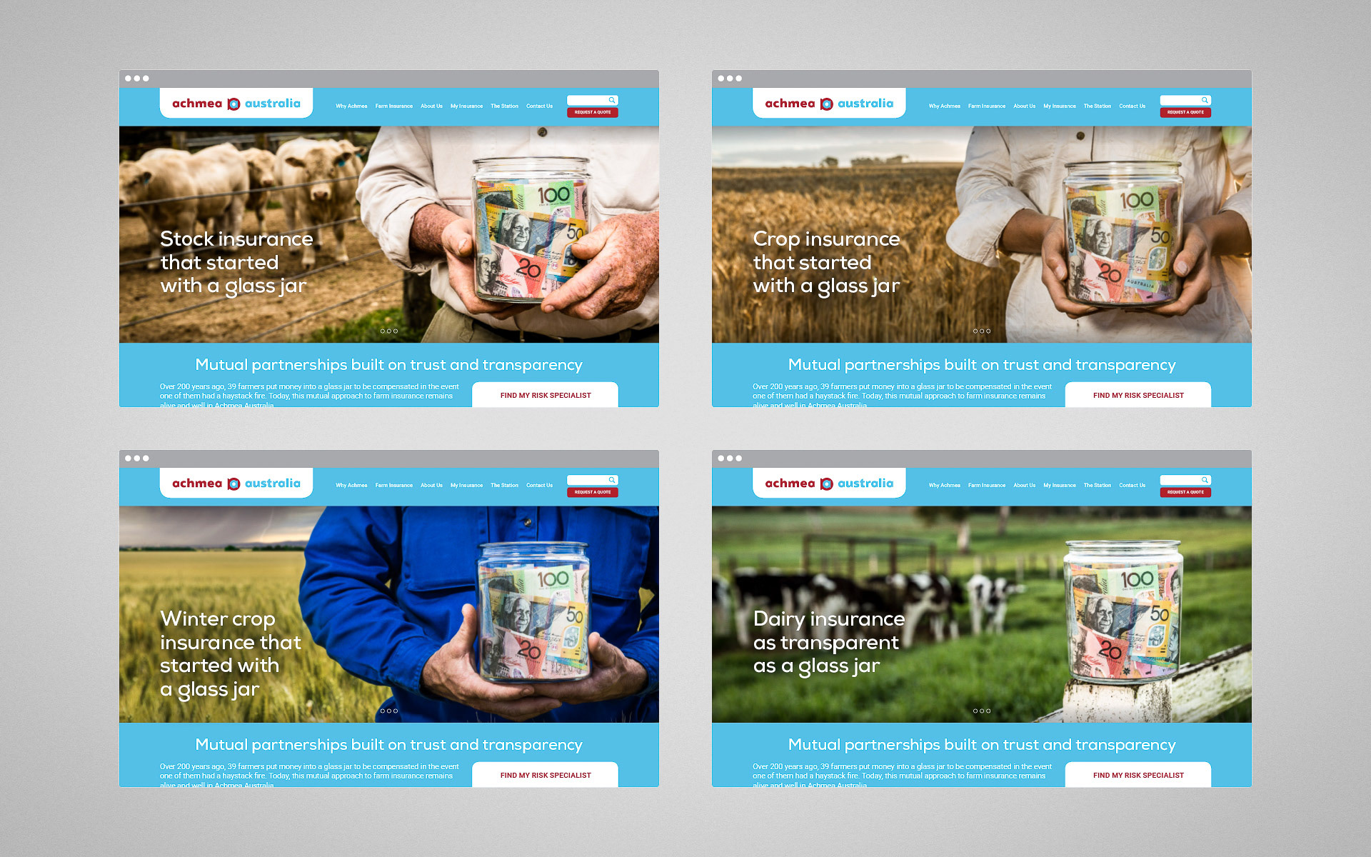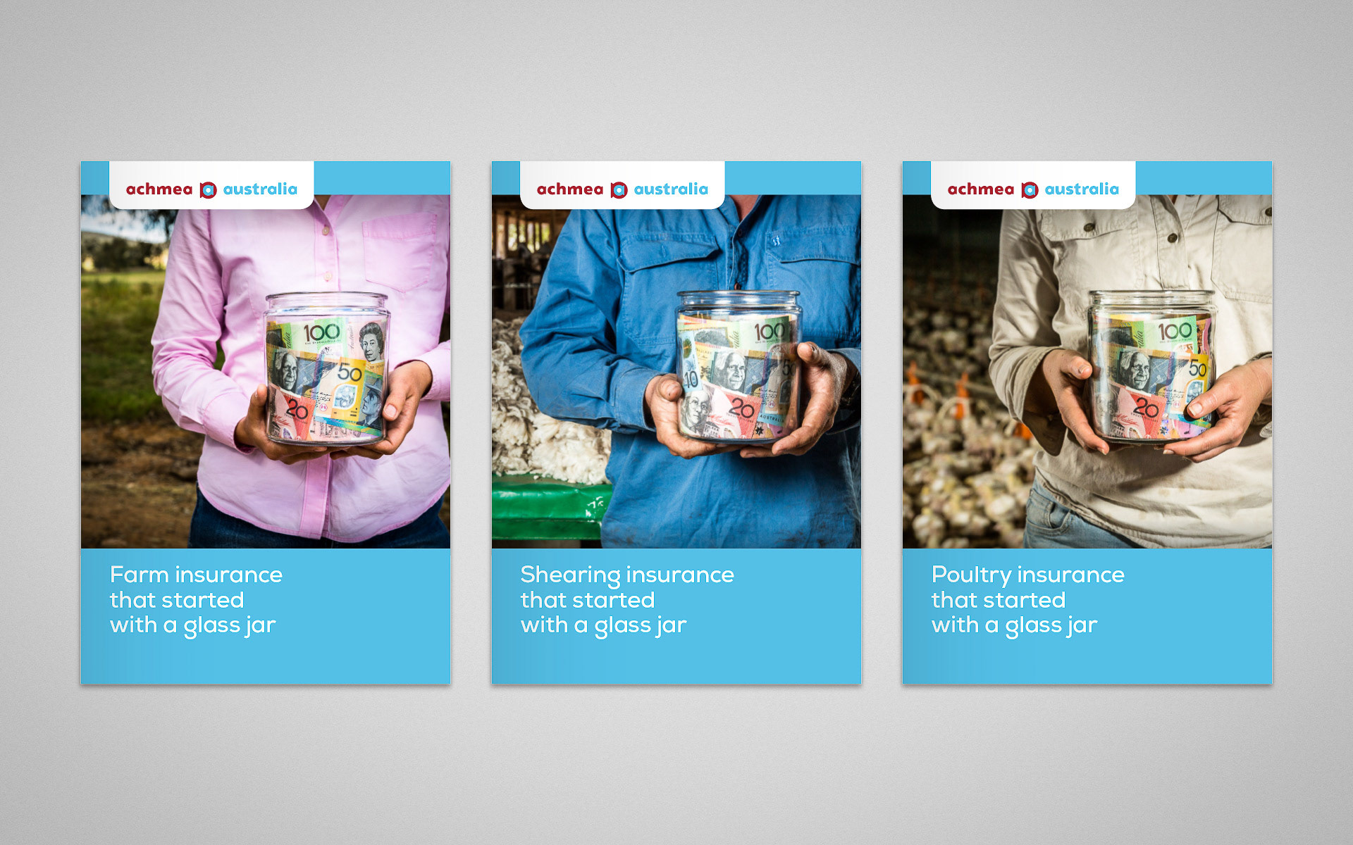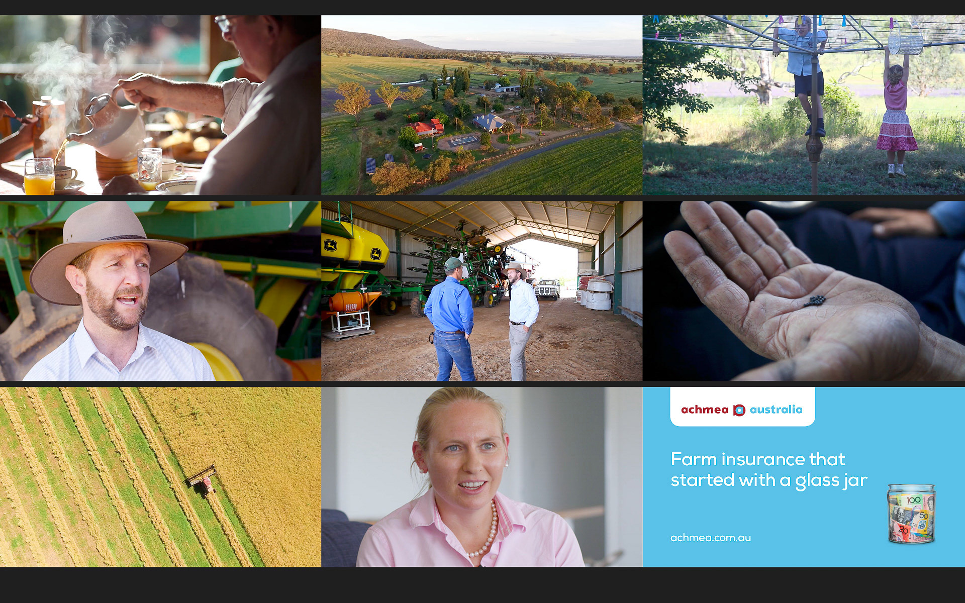 Achmea was established over 200 years ago when 39 Dutch farmers put money into a glass jar to be compensated in the event one of them had a haystack fire. This mutual approach to farm insurance remains alive and well in Achmea Australia today. The brand campaign set out to tell this unique story by putting Achmea’s 200 year old glass jar into the hands of today’s farmers. The glass jar became synonymous with Achmea Australia as a symbol of their dedication to mutual partnerships built on trust and transparency.