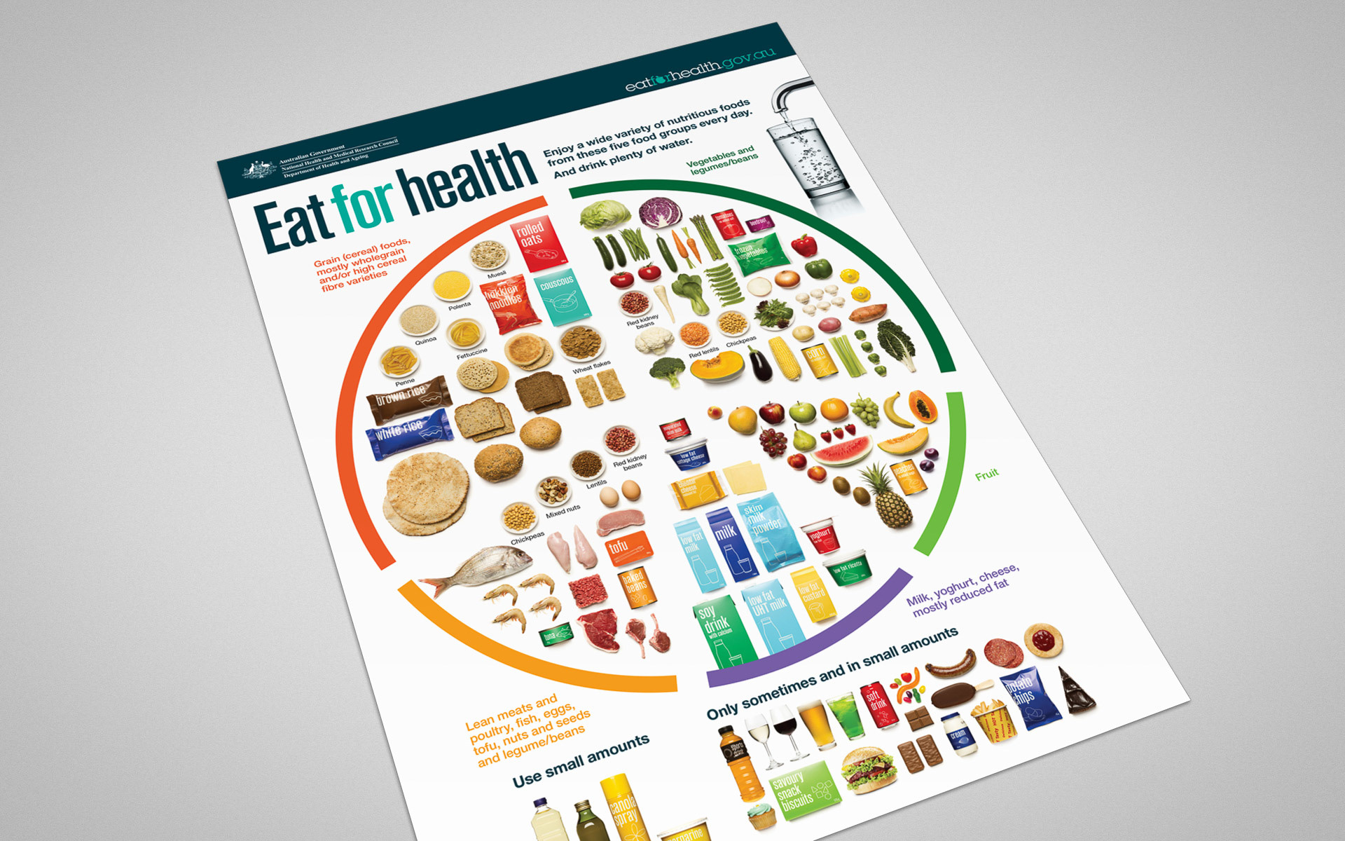 The National Health & Medical Research Council, Australia's leading authority on health and medical research, aims to provide the public with reliable, evidence-based, and up-to-date health advice. In regards to nutrition, their outdated 'Food Pyramid' needed a fresh approach to better represent current dietary guidelines. The solution was a pie chart composed of individually photographed, easily recognisable foods, arranged in their correct groups and portion sizes.